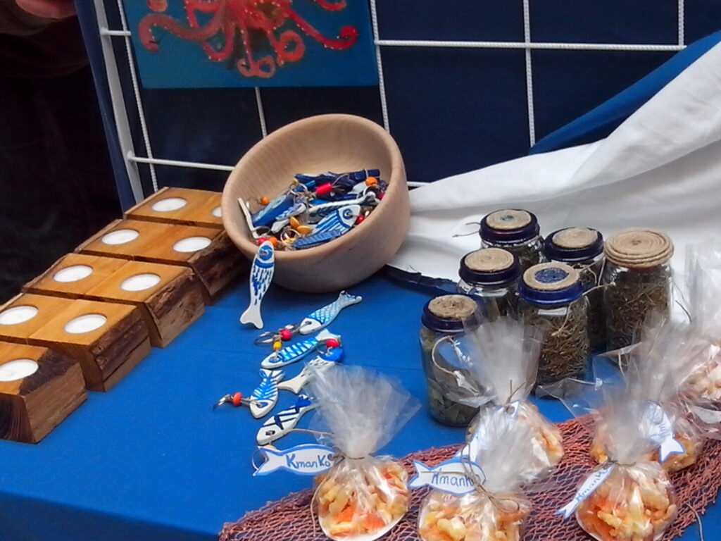 Prekrili smo stol plavom tkaninom i ribarskom mrežom i izložili privjeske za ključeve u obliku riba, drvene ključonoše s motivima jedrenjaka, drvene svjećnjake, vrećice sa lavandom i arancinima, bočice s aromatičnim biljem i torbe za likovnu mapu sa motivima školjki i riba.