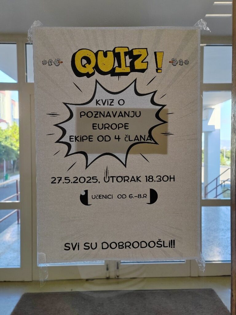U sklopu obilježavanja Dana Europe, u organizaciji učiteljica M. Gojsalić, S. Omazić i V. Šiklić u školskom atriju održan je kviz o poznavanju našeg kontinenta za učenike sedmih i osmih razreda. Sudjelovali su i neki naši bivši učenici, današnji srednjoškolci.