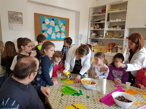 Za nekoliko dana išli smo u posjet Centru Slava Raškaj. U dvorani smo gledali odrasle s poteškoćama kako rade vježbe. Kasnije smo išli posjetiti djecu u učionicama. Kada smo završili s obilaskom, išli smo na radionicu. Tamo smo pomogli djeci s poteškoćama raditi jaja od krep papira. Iz jaja su virili pilići. Predsjednik i potpresjednik našeg razreda dali su im darove: naš školski list Kmanko i buket cvijeća koji smo napravili na satu Likovne kulture. Oni su nama darovali svoj časopis i šalicu oslikanu njihovim prekrasnim radom.